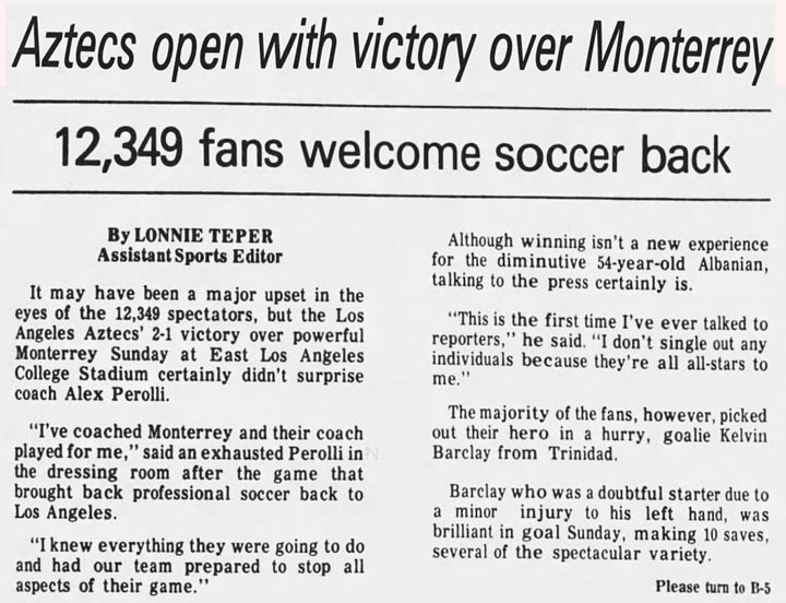 | Monterrey (Mexico) at Los Angeles Aztecs Date: April 7, 1974 Aztecs won 2-1 Attendance: 12,349 Goals: Aztecs-Uri Banhoffer, Jerry Kazarian Monterrey-Basilio Salazar |