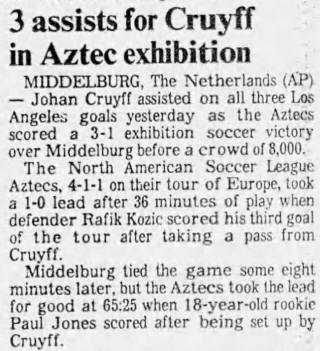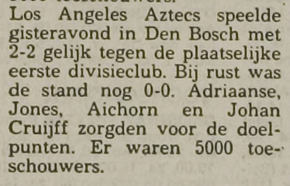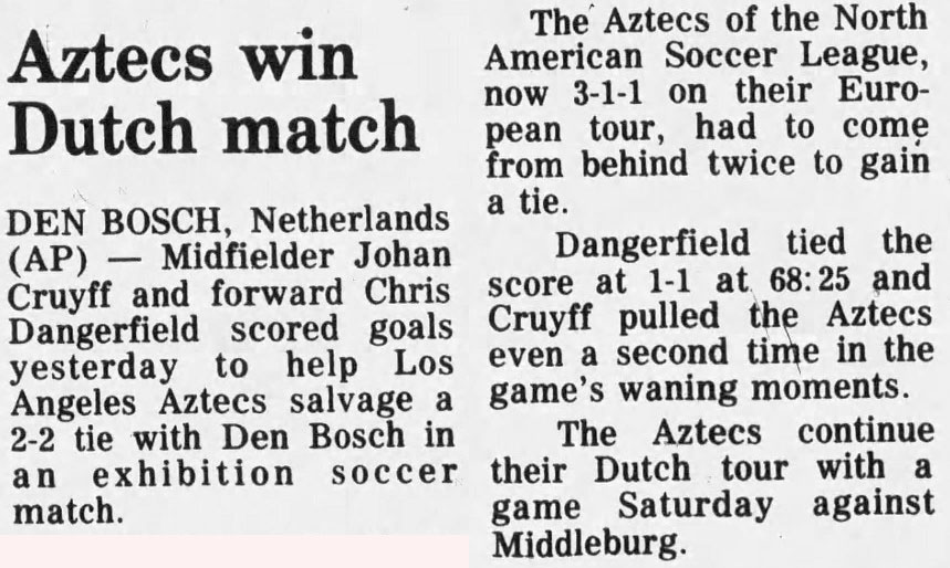 | Los Angeles Aztecs at Den Bosch (Netherlands) Date: October 5, 1979 Aztecs tied 2-2 Attendance: 8,000 Goals: Aztecs-Johan Cruyff, Chris Dangerfield |