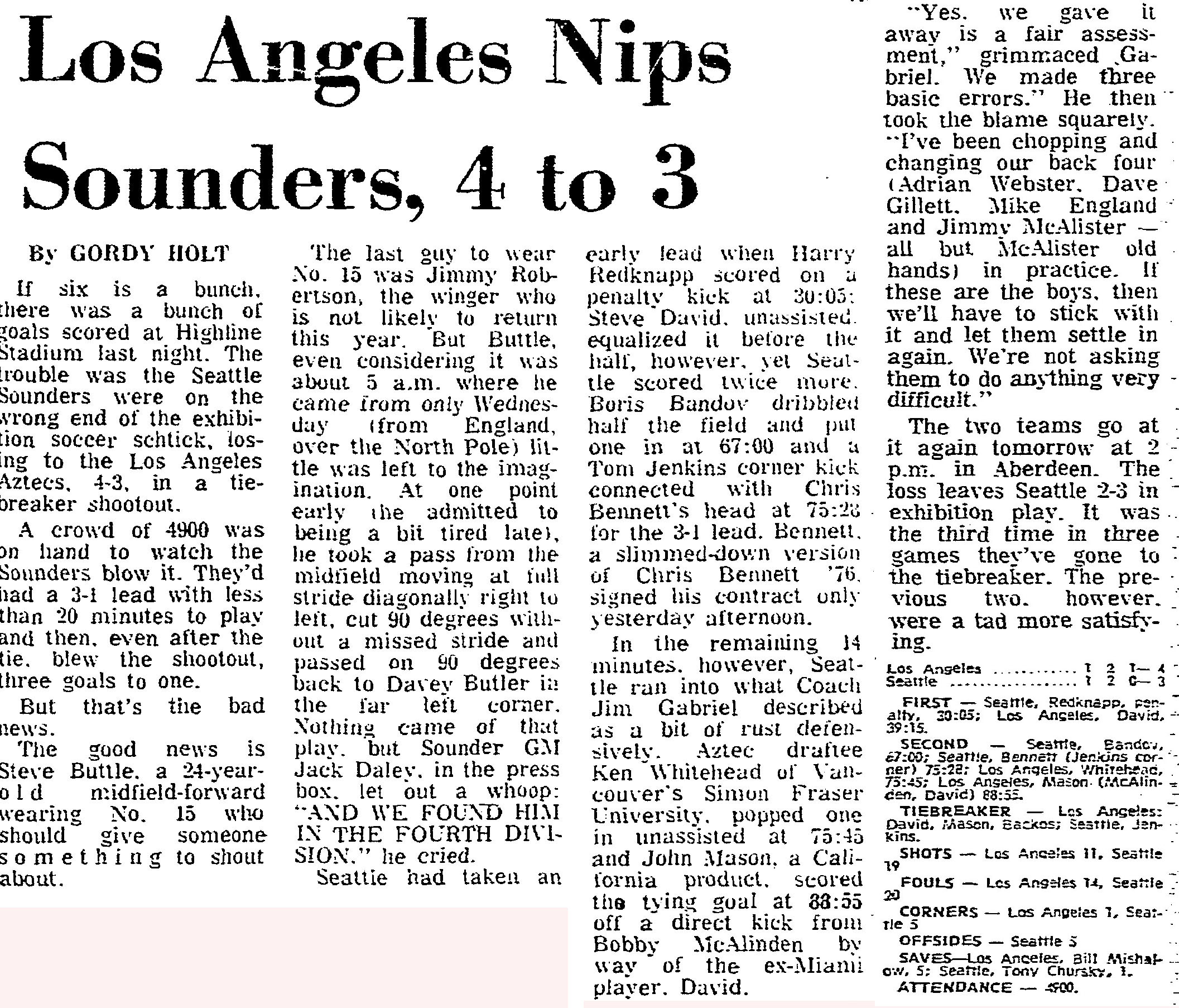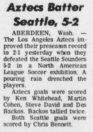 (Aberdeen, Washington) Date: March 20, 1977 Aztecs won 5-2 Attendance: Goals: Aztecs-Ken Whitehead, Martin Cohen, Steve David, Des Backos (2) Sounders-Chris Bennett (2) |