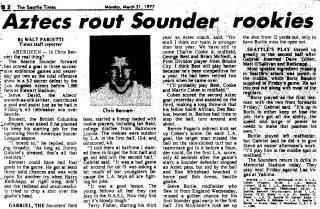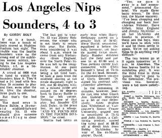 | Los Angeles Aztecs at Vancouver Whitecaps Date: March 22, 1977 Aztecs lost 2-1 Attendance: 1,500 Goals: Whitecaps-Glen Johnson, Brian Budd Aztecs-Steve David |