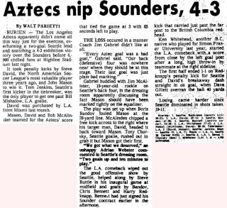 (Yakima, Washington) Date: April 7, 1975 Sounders lost 4-2 Attendance: 3,500 Goals: Sounders-Jim Gabriel (2) Aztecs-Juli Veee, Jerry Kazarian, Uri Banhoffer, Tony Douglas |