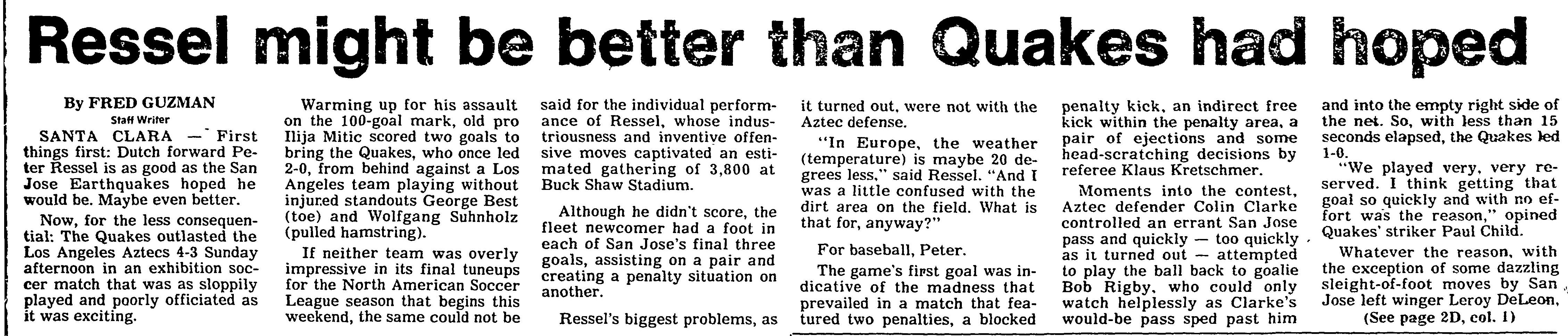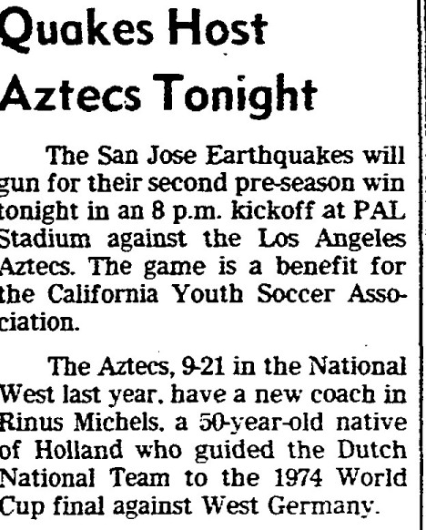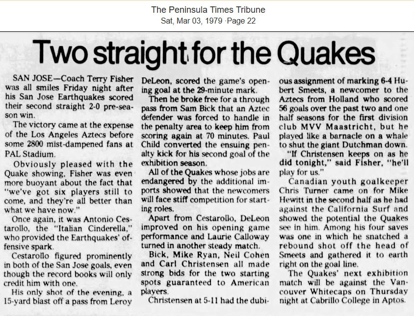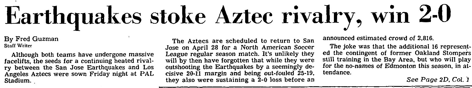 | Los Angeles Aztecs vs. San Jose Earthquakes Date: March 2, 1979 Aztecs lost 2-0 Attendance: 2,816 Goals: Earthquakes-Antonio Cestarollo, Paul Child |