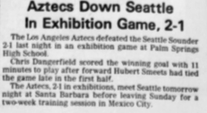 Springs, California) Date: March 8, 1979 Aztecs won 2-1 Attendance: Goals: Aztecs-Hubert Smeets, Chris Dangerfield Sounders- |