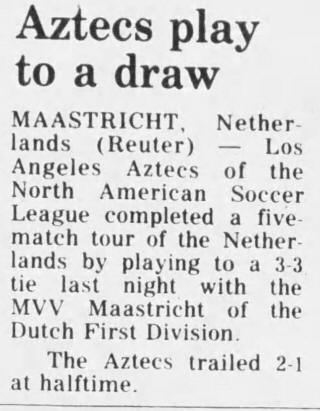 | Los Angeles Aztecs at Steenwijk (Netherlands) Date: September 30, 1979 Aztecs won 2-0 Attendance: 5,000 Goals: Aztecs-Refik Kozic, Clyde Best |
