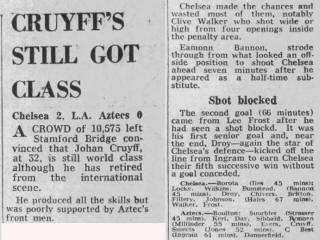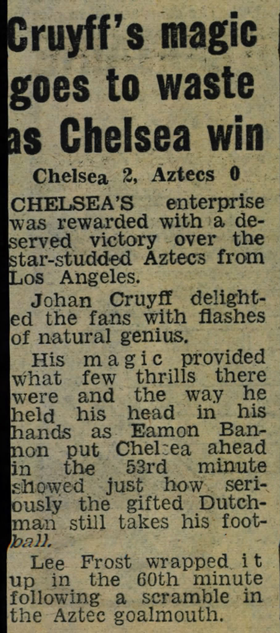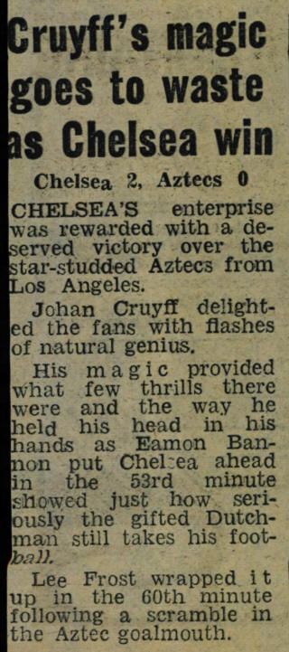 | Los Angeles Aztecs at Chelsea (England) Date: October 17,1979 Aztecs lost 2-0 Attendance: 10,575 Goals: Chelsea-Eamon Bannon, Lee Frost |