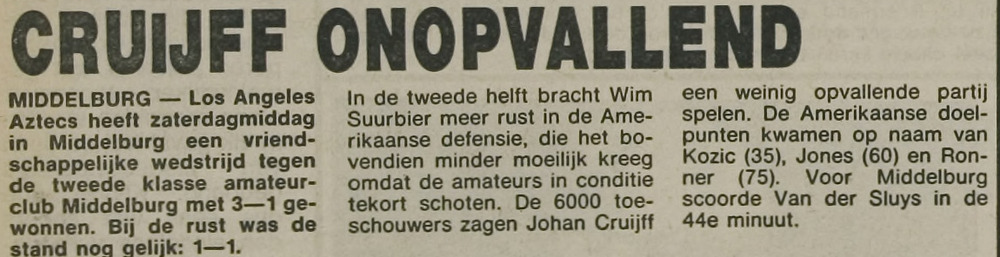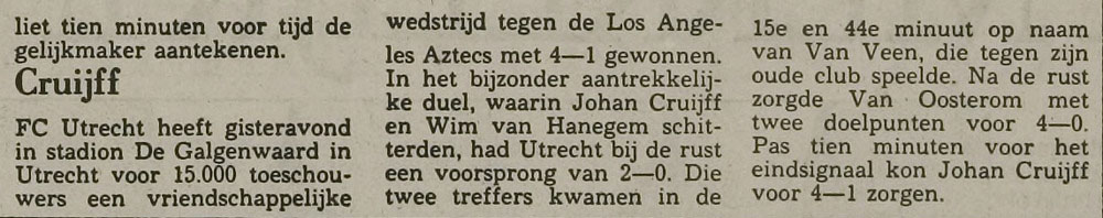 | Los Angeles Aztecs at F.C. Utrecht (Utrecht, Netherlands) Date: October 5, 1979 Aztecs lost 4-1 Attendance: 15,000 Goals: Aztecs-Johan Cruyff Utrecht-Leo Van Veen (2), Ron Van Oosterom (2) |