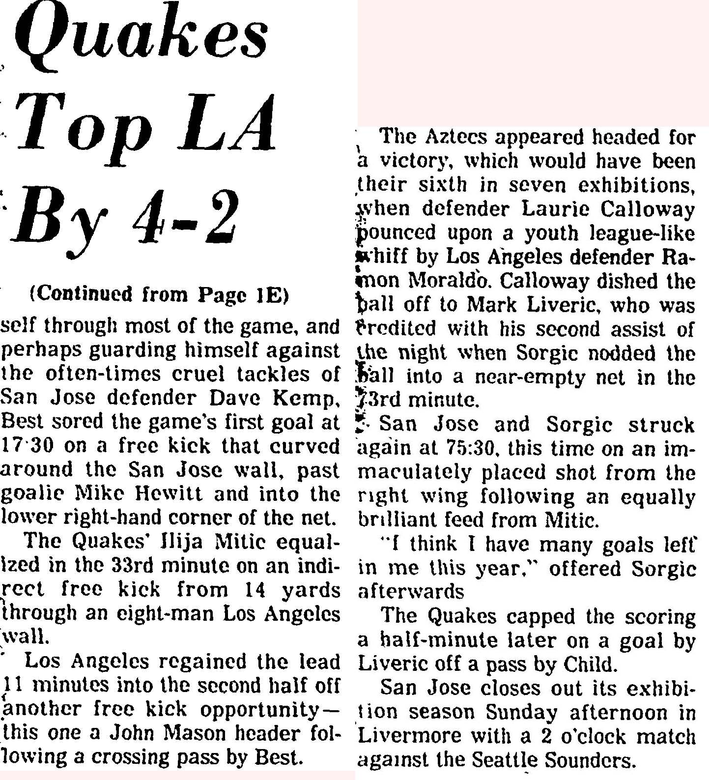 (Fresno, California) Date: April 9, 1976 Aztecs lost 4-2 Attendance: Goals: Earthquakes-Ilija Mitic, George Sorgic (2), Mark Liveric Aztecs-George Best, John Mason |