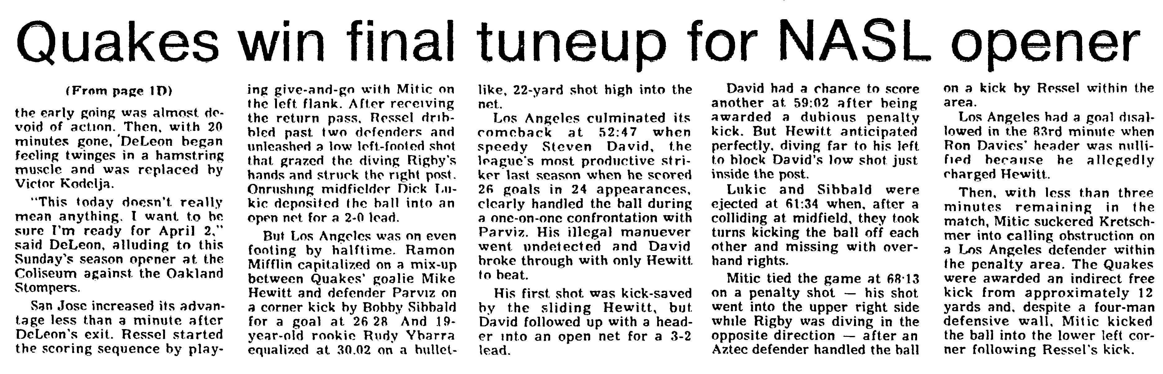 (Santa Clara, California) Date: March 26, 1978 Aztecs lost 4-3 Attendance: Goals: Aztecs-Ramon Mifflin, Rudy Ybarra, Steve David Earthquakes-Own Goal, Dusan Lukic, Ilija Mitic (2) |