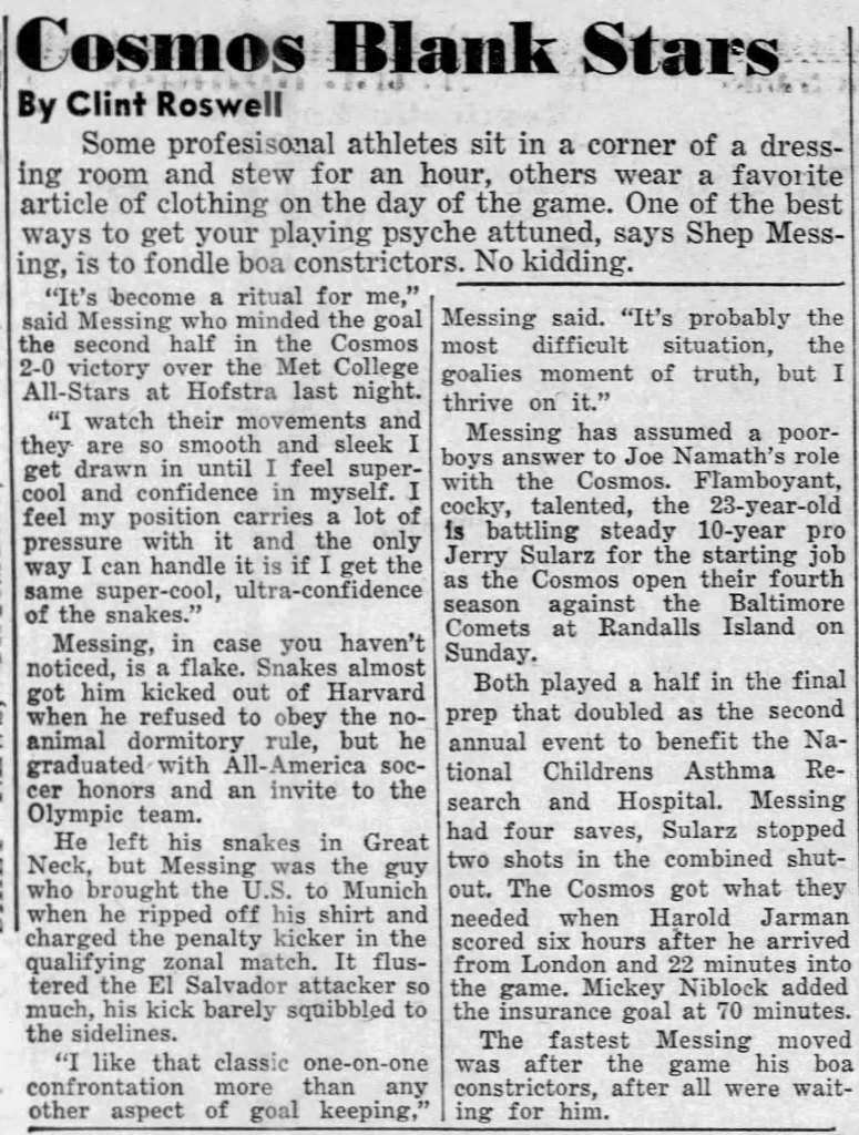 York, New York) Date: July 14, 1974 Cosmos lost 3-1 Attendance: 500 Goals: Cosmos-Carlos Scott Italian Army-Vincenzo Chiarenza (3) |