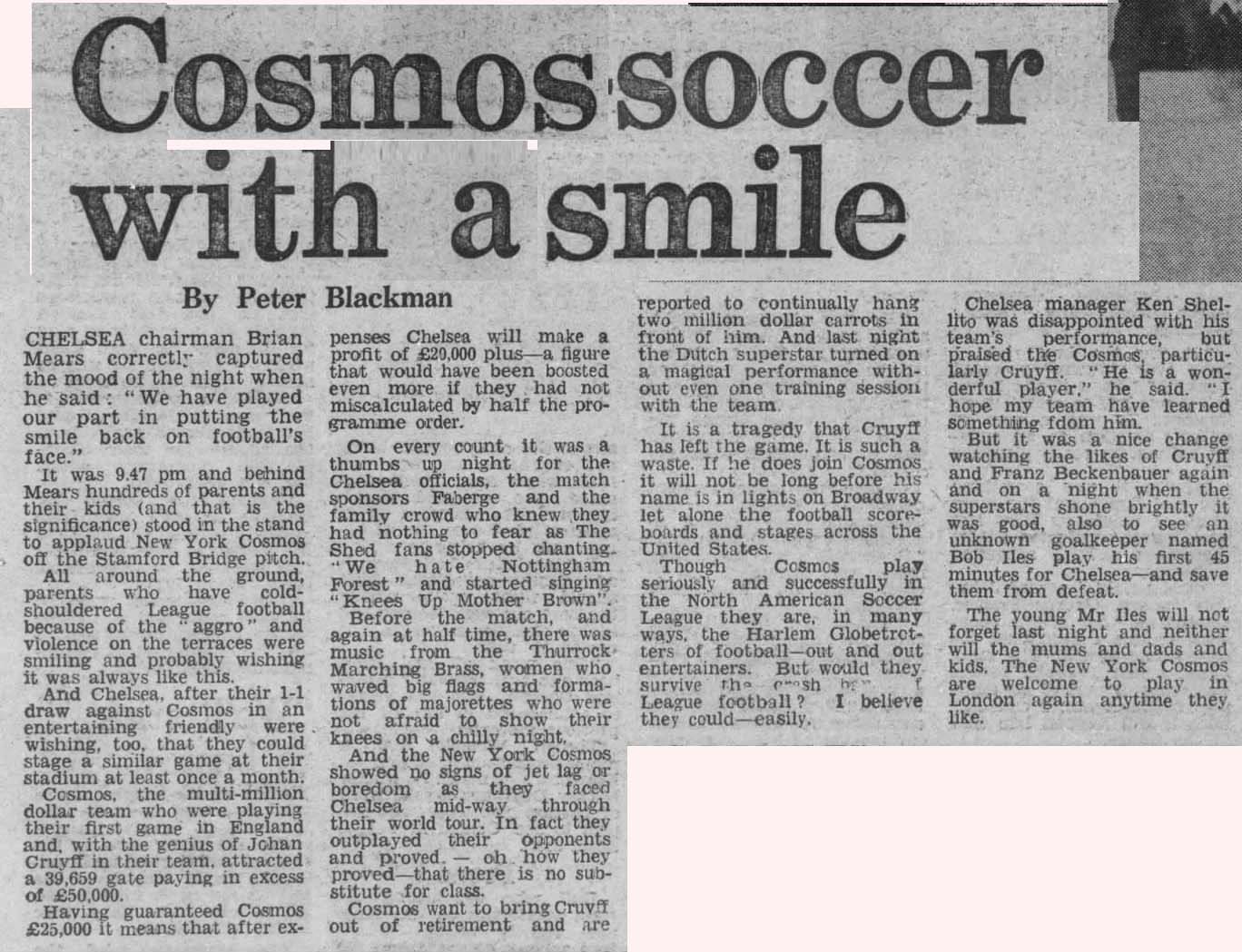 (England) Date: September 26, 1978 Cosmos tied 1-1 Attendance: 39,659 Goals: Cosmos-Dennis Tueart Chelsea-Ray Wilkins |