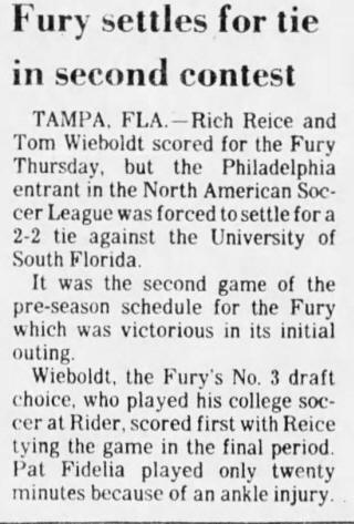 | Philadelphia Fury vs. New England Tea Men Date: March 8, 1979 Fury lost 3-1 Attendance: Goals: Fury-Pat Fidelia Tea Men-Brian Anderson, Roger Gibbins, Scott Courtney |
