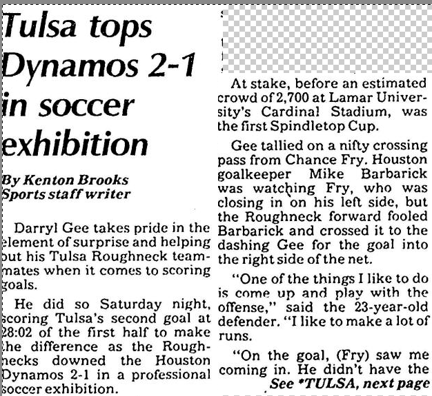 | Tulsa Roughnecks at Houston Dynamos (USL) Date: June 1, 1985 Roughnecks tied 2-2 Attendance: 2,011 Goals: Roughnecks-Elvis Comrie, Chance Fry |