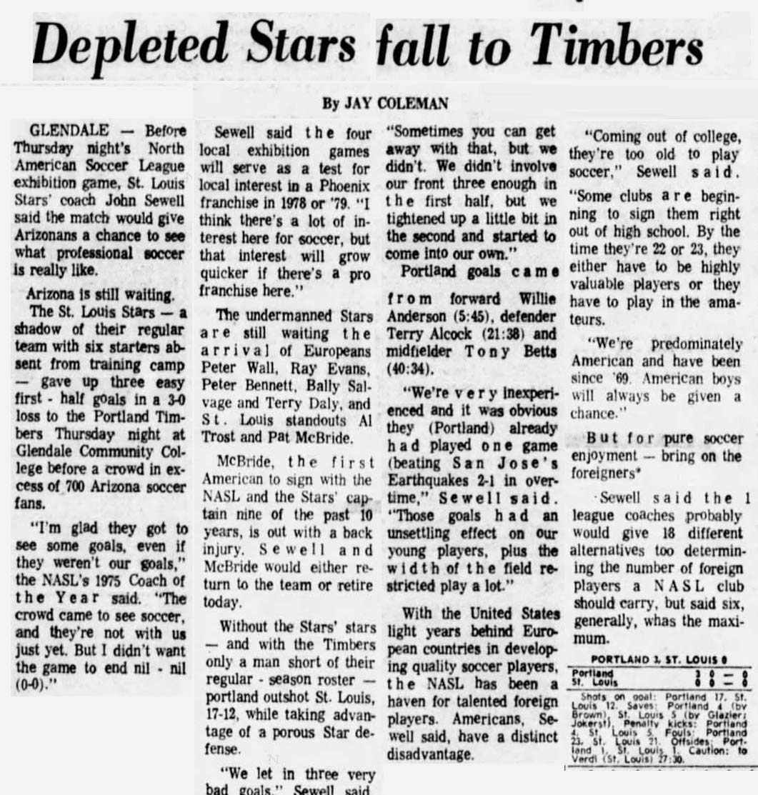 (Glendale, Arizona) Date: March 17, 1977 Stars lost 3-0 Attendance: 700 Goals: Timbers-Willie Anderson, Terry Alcock, Tony Betts |