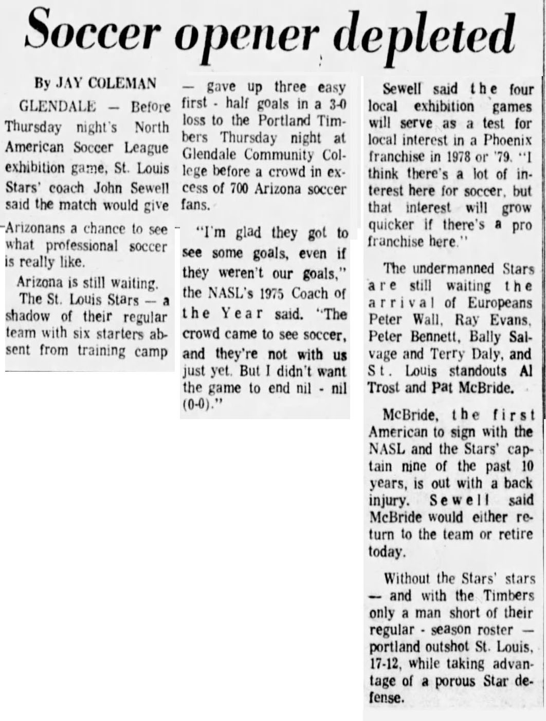 Arizona) Date: March 20, 1977 Stars won 2-1 Attendance: 1,000 Goals: Stars-Al Trost, |