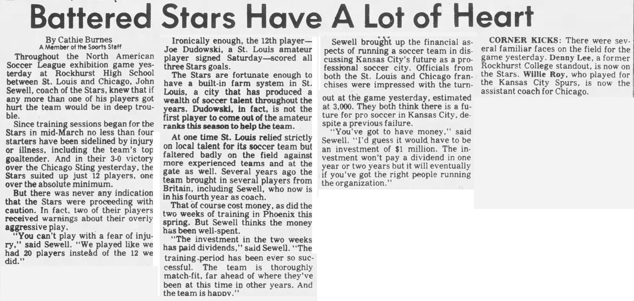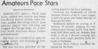 St. Louis Stars (Kansas City, Missouri) Date: April 3, 1977 Stars won 3-0 Attendance: 3,000 Goals: Stars-Joe Dudkowski (3) |