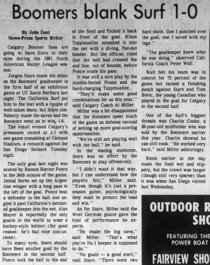 Date: March 21, 1981    Boomers won 1-0     Attendance: