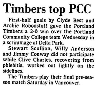 Goals: Timbers-Stewart Scullion, John Bain (2)      College: Mark Miller, Brent Goulet, Glenn Lurie