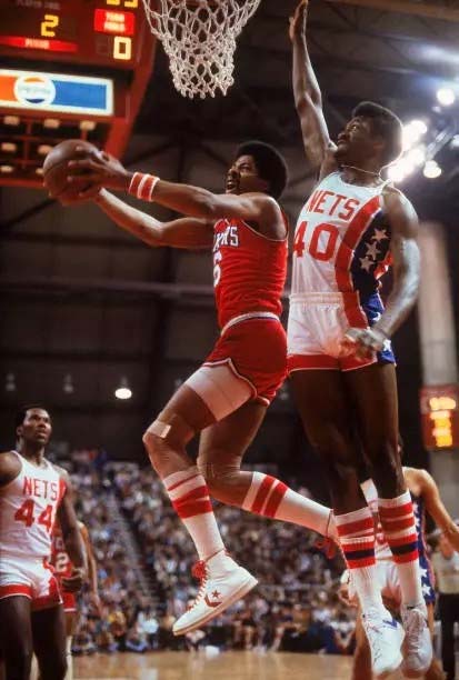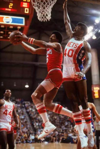 ![]() Ralph Simpson (44), Julius Erving (6), Harvey Catchings (40) Philadelphia 76ers at New Jersey Nets |