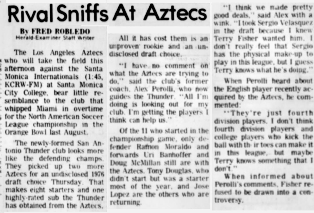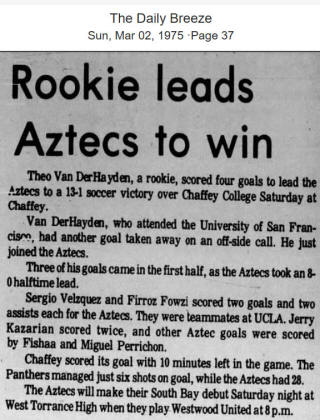 International (Santa Monica, California) Date: March 21, 1975 Aztecs won 3-0 Attendance: 200 Goals: Aztecs-Sergio Velazquez, Theo Van Derlladen, Uri Banhoffer |