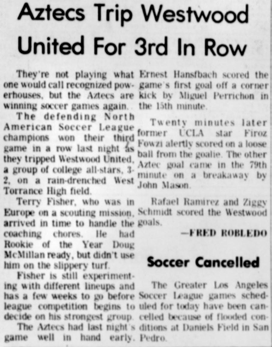 (Torrance, California) Date: March 8, 1975 Aztecs won 3-2 Attendance: 200 Goals: Aztecs Ernesto Hansbach, Firooz Fowzi, John Mason Westwood-Rafael Ramirez, Siggy Schmidt |