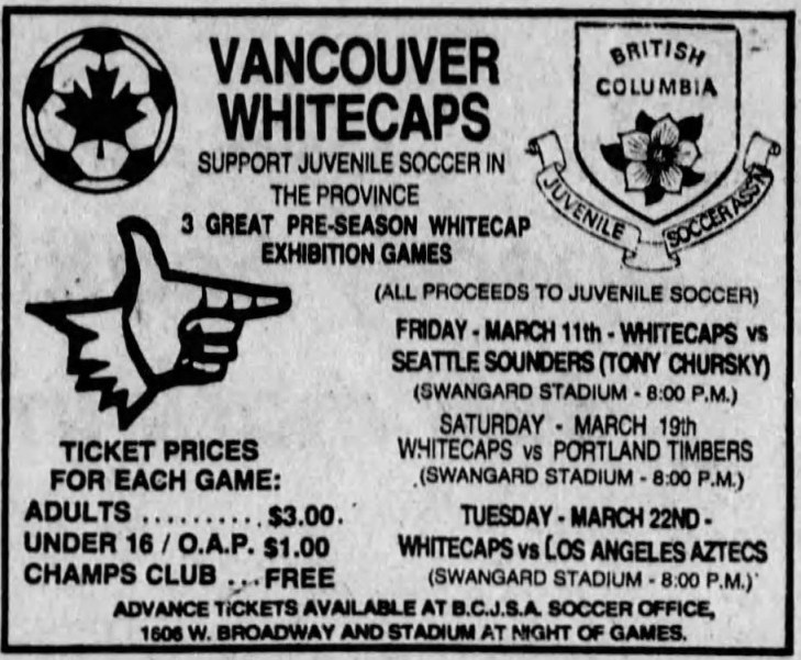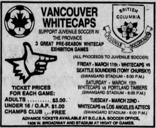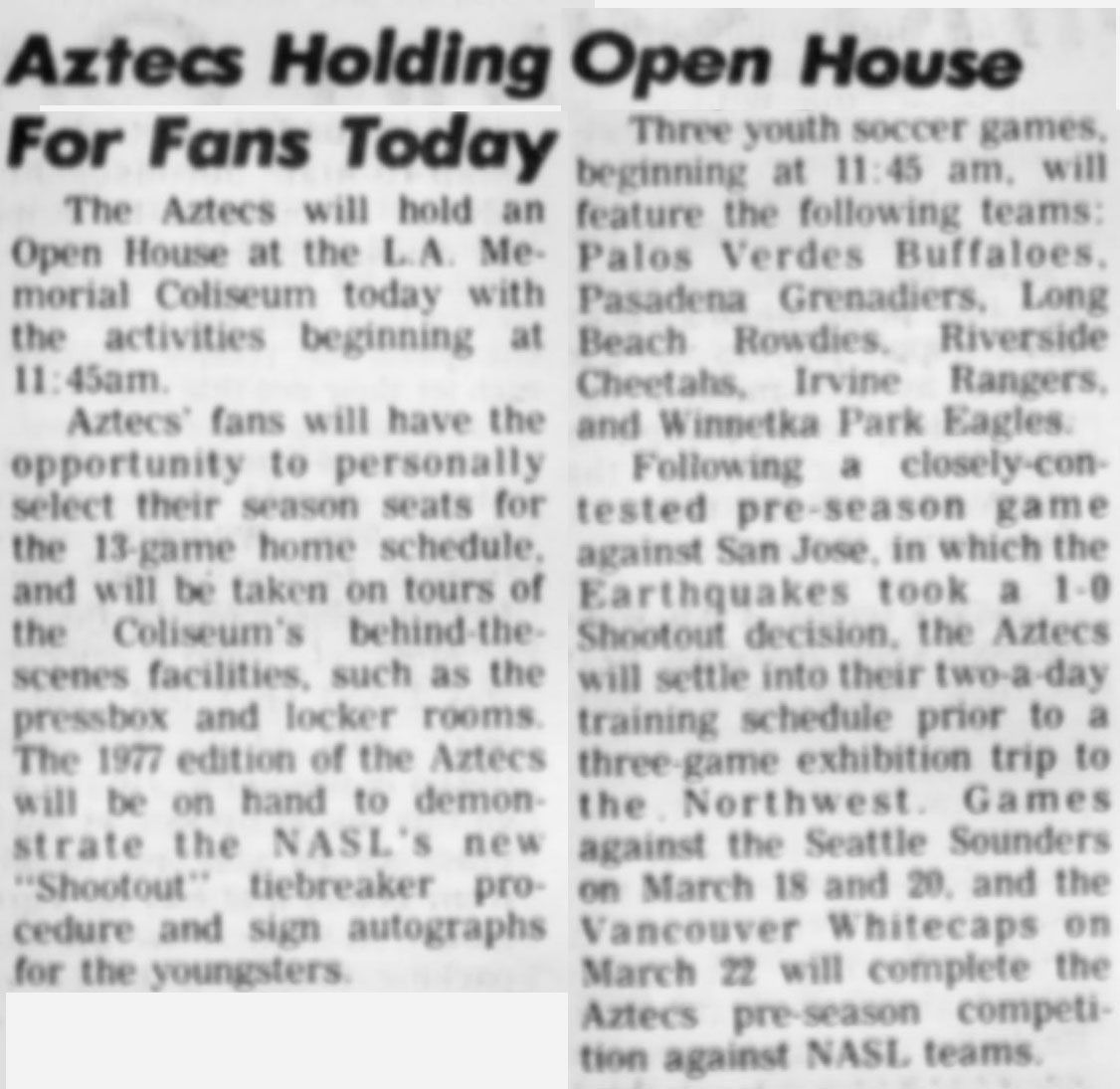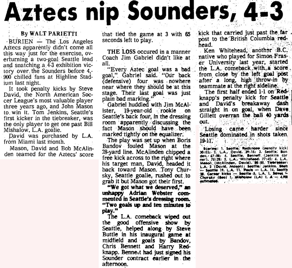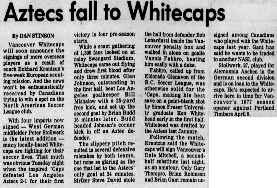 | Los Angeles Aztecs at Vancouver Whitecaps Date: March 22, 1977 Aztecs lost 2-1 Attendance: 1,500 Goals: Whitecaps-Glen Johnson, Brian Budd Aztecs-Steve David |