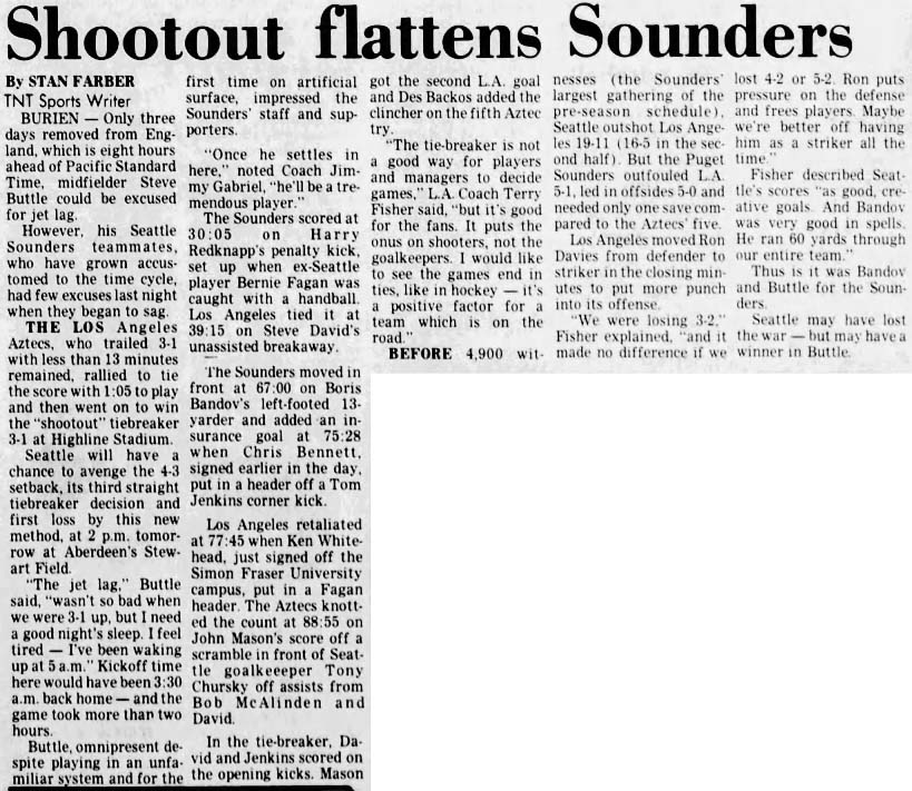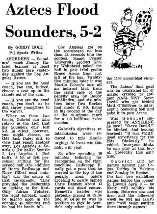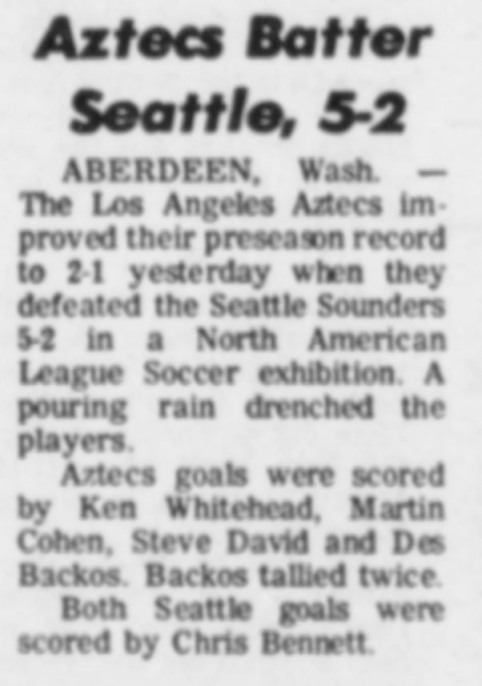 (Aberdeen, Washington) Date: March 20, 1977 Aztecs won 5-2 Attendance: Goals: Aztecs-Ken Whitehead, Martin Cohen, Steve David, Des Backos (2) Sounders-Chris Bennett (2) |