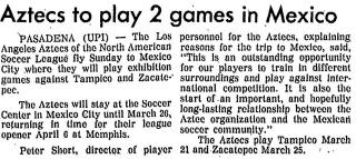 | Club America (Mexico) at Los Angeles Aztecs Date: April 21, 1974 Aztecs lost 2-1 Attendance: 14,211 Goals: Aztecs-Tony Douglas Club America-Sergio Ceballos, Castro |
