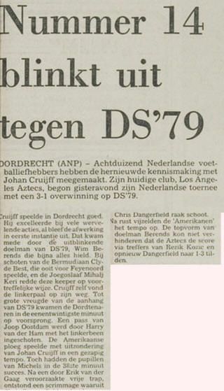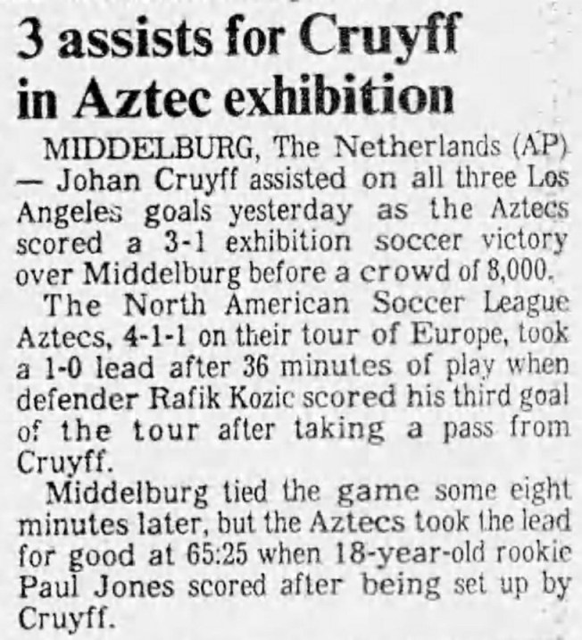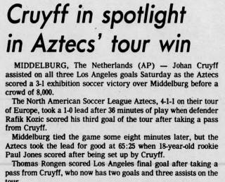 | Los Angeles Aztecs at Den Bosch (Netherlands) Date: October 5, 1979 Aztecs tied 2-2 Attendance: 8,000 Goals: Aztecs-Johan Cruyff, Chris Dangerfield |