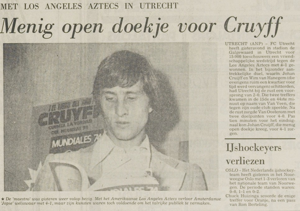 | Los Angeles Aztecs at F.C. Utrecht (Utrecht, Netherlands) Date: October 5, 1979 Aztecs lost 4-1 Attendance: 15,000 Goals: Aztecs-Johan Cruyff Utrecht-Leo Van Veen (2), Ron Van Oosterom (2) |