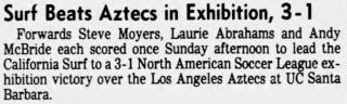 Barbara, California) Date: March 9, 1980 Aztecs lost 3-1 Attendance: Goals: Aztecs- Surf-Steve Moyers, Laurie Abrahams, Andy McBride |