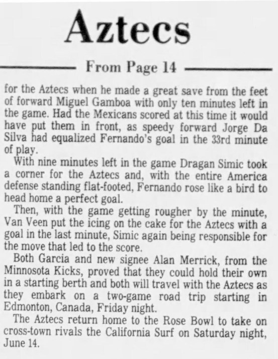 Springs, California) Date: March 1, 1980 Aztecs won 2-0 Attendance: Goals: Aztecs-John McGrane, Mihalj Keri |