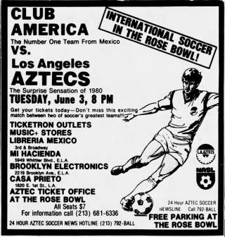 | Club America (Mexico) at Los Angeles Aztecs Date: June 3, 1980 Aztecs won 3-1 Attendance: 12,603 Goals: Aztecs-Luis Fernando (2), Club America-Jorge Da Silva |