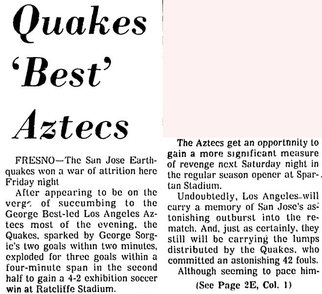 (Fresno, California) Date: April 9, 1976 Aztecs lost 4-2 Attendance: Goals: Earthquakes-Ilija Mitic, George Sorgic (2), Mark Liveric Aztecs-George Best, John Mason |