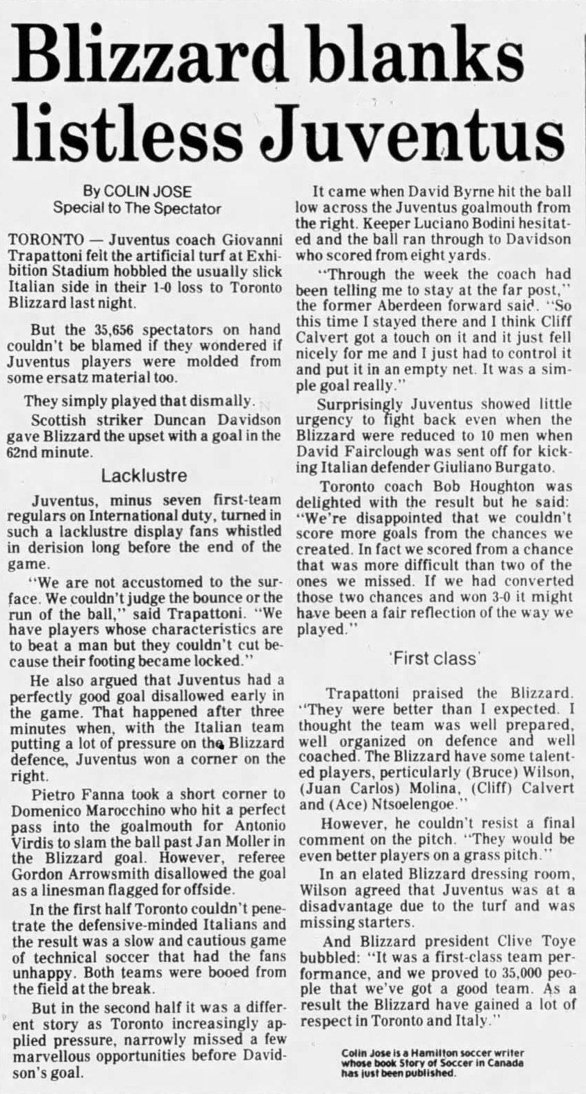 | Juventus (Italy) at Toronto Blizzard Date: May 30,1982 Blizzard won 1-0 Attendance: 35,656 Goals: Blizzard-Duncan Davidson |