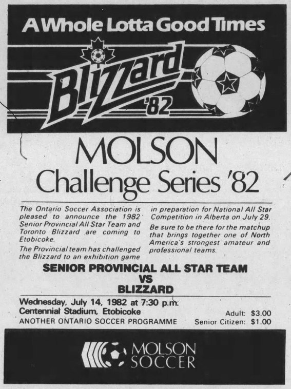Date: August 16, 1982 Blizzard won 2-1 Attendance: 2,600 Goals: Blizzard-Duncan Davidson, Frank Ciacca Sault Selects-Pat Lillie |