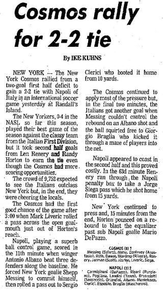 | Napoli (Italy) at New York Cosmos Date: May 26, 1974 Cosmos tied 2-2 Attendance: 9,752 Goals: Cosmos-Randy Horton, Len Renery Napoli-Giorgio Braglia, Sergio Clerici |