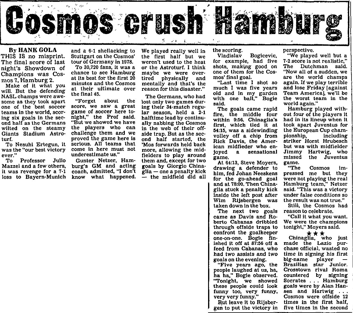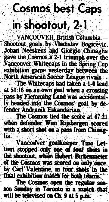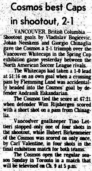 Bogicevic tied the game in the 34th minute on a well-executed giveand-go with Romero. In the 74th minute, Romero scored, assisted by Eskandarian and Franz Beckenbauer.
