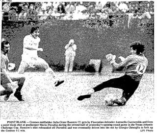 Mazzei, referring to Sao Paulo's second score, would not fault any player by name. But it was Bogicevic who passed the ball back to Birkenmeier after a goal kick while the Cosmos' goalkeeper was looking the other way. Careca intervened and put the ball in the net, tying the game, six minutes after Romero had put the Cosmos in the lead.
