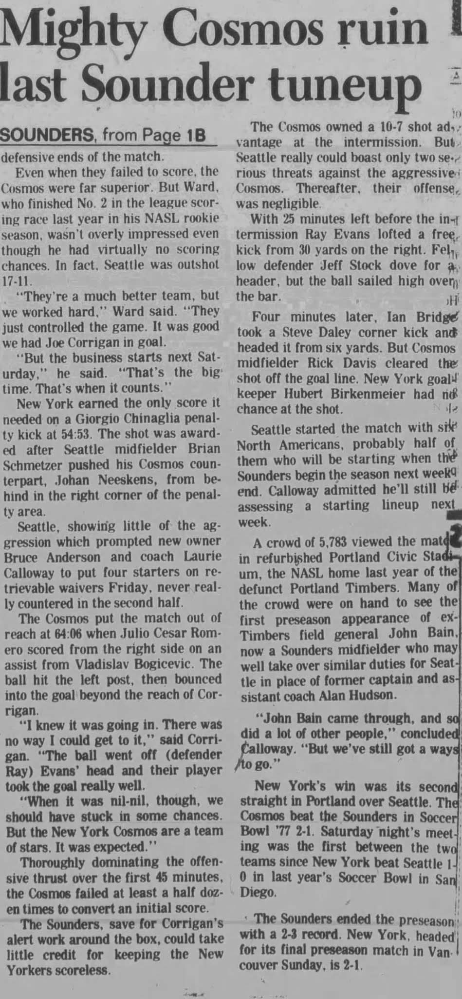 The Cosmos were outplayed for almost the entire game. After five straight impressive victories, the Cosmos lacked organization and coordination, passing sloppily and getting little support in midfield, especially from Roberto Cabanas, who was replaced by Angelo DiBernardo in the 70th minute.