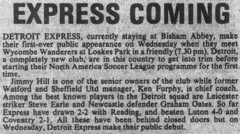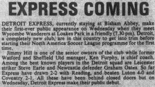 | Detroit Express at Wycombe Wanderers (England) Date: March 1, 1978 Express lost 3-2 Attendance: Goals: Express-Danny Vaughn, Roberto Arciniego Wycombe-Howard Kennedy, Horseman |