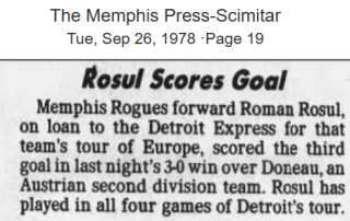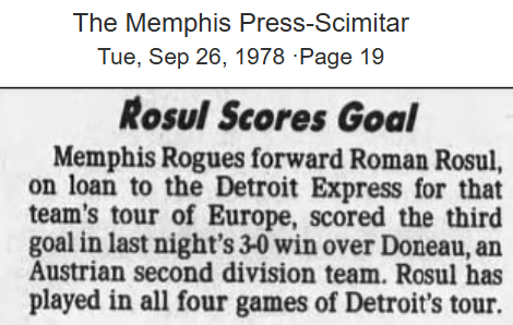 | Detroit Express at Doneau (Austria) Date: Sept 2x, 1978 Express won 3-0 Attendance: Goals: Express-Roman Rosul, Joey Fink, |