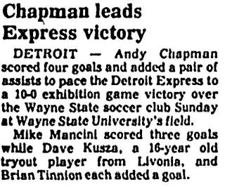 | Wayne State University vs. Detroit Express Date: May 17, 1981 Express won 10-0 Attendance Goals: Express-Mike Mancini (3), Dave Kusza, Brian Tinnion |