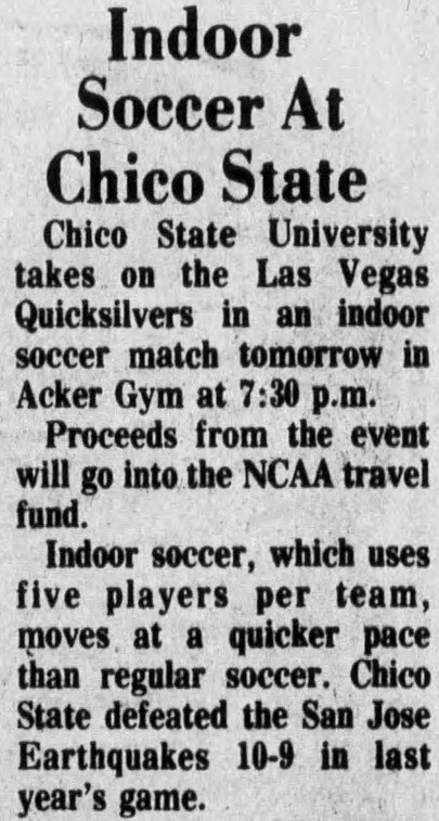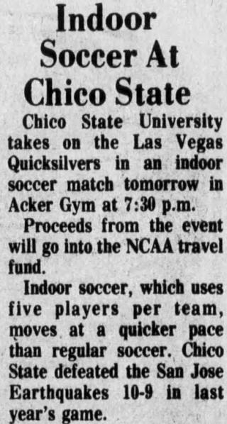 University (Chico, California) Date: March 15, 1977 Quicksilvers won 19-6 (Indoor) Attendance: 2,000 Goals: Quicksilvers-Victor Arbalaez, Art Welch, Gerry Ingram, Brian Joy, Derek Trevis Chico-Dee J Harding (2), Dan Payne, Mike Payne, Juan Martinez, Larry Nees |