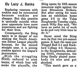 | Tulsa Roughnecks at Chicago Sting Date: May 8, 1984 Roughnecks won 2-0 Attendance: 2,000 Goals: Roughnecks-Chance Fry, Brian Schmetzer |