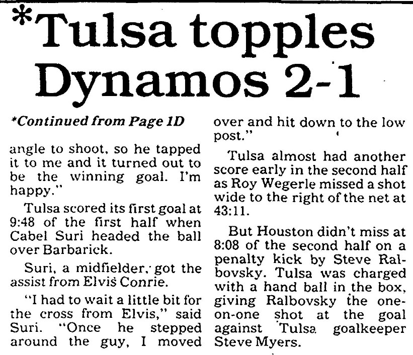 | Tulsa Roughnecks at Houston Dynamos (USL) Date: June 1, 1985 Roughnecks tied 2-2 Attendance: 2,011 Goals: Roughnecks-Elvis Comrie, Chance Fry |