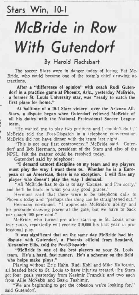 | St. Louis Stars at Latin-American Club Date: November 5, 1969 Stars won 8-0 Attendance: Goals: Stars-Pat McBride (3), Larry Hausmann (3), Jerry Mueller, Dragan Popovic |