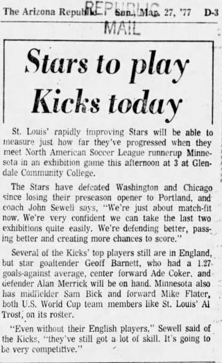 Arizona) Date: March 27, 1977 Stars lost 4-0 Attendance: 1,750 Goals: Kicks-Tim Twellman (3), Steve Litt |