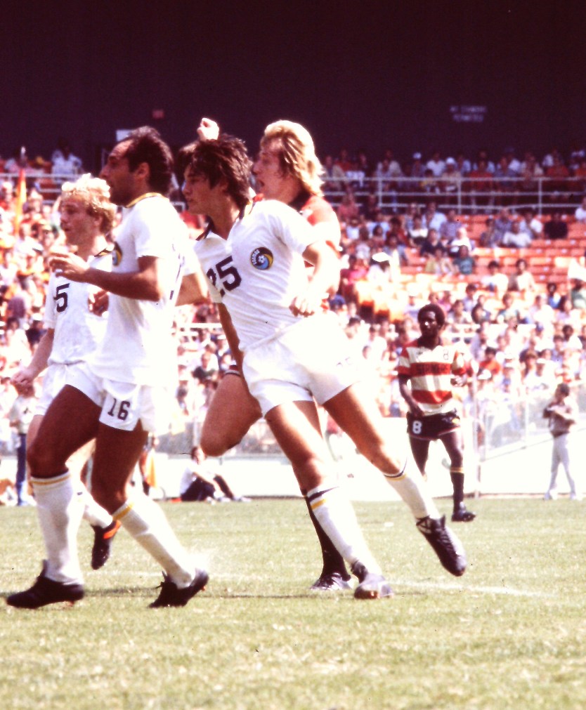![]() Bob Iarusci (3), Arno Steffenhagen (6), Karl-Heinz Granitza (12),Jeff Durgan (4) New York Cosmos at Chicago Sting Soccer Bowl '81 |
