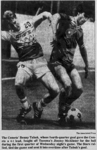 ![]() Mark Kerlin (L), Jimmy McAlister (R) MISL Baltimore Blast at Tacoma Stars, January 15, 1986 |