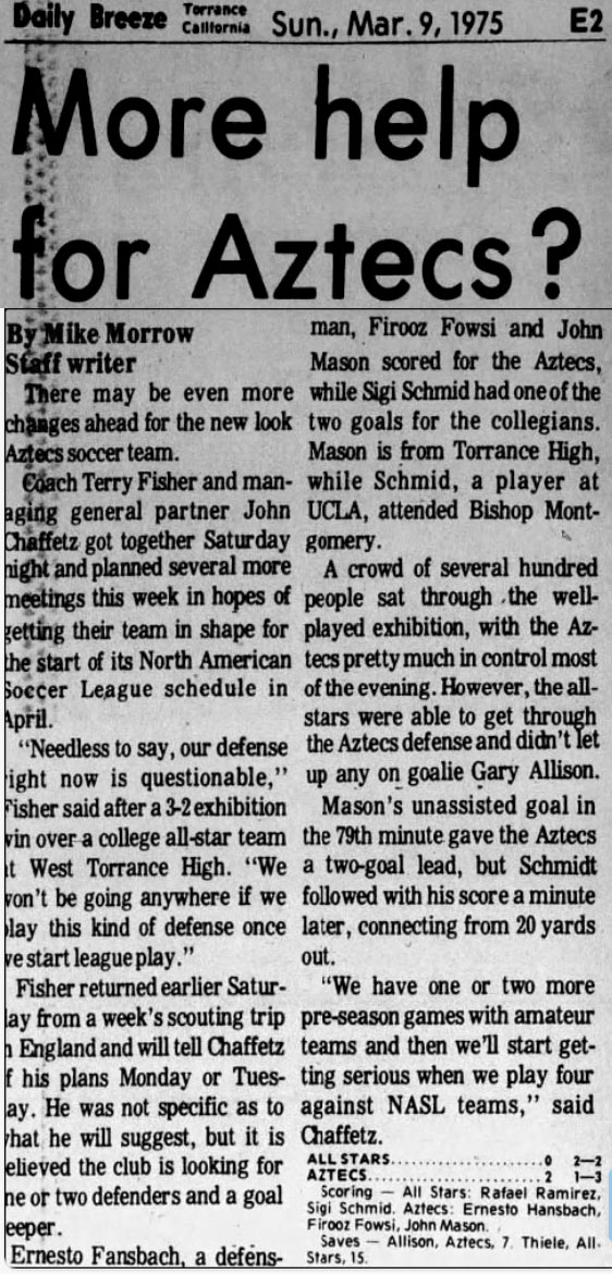 (Torrance, California) Date: March 8, 1975 Aztecs won 3-2 Attendance: 200 Goals: Aztecs Ernesto Hansbach, Firooz Fowzi, John Mason Westwood-Rafael Ramirez, Siggy Schmidt |